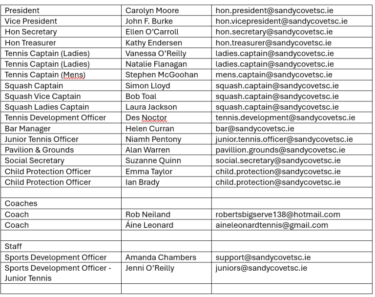Post to: Sandycove Tennis & Squash Club, Elton Park, Sandycove, Co. Dublin, A96 HX97